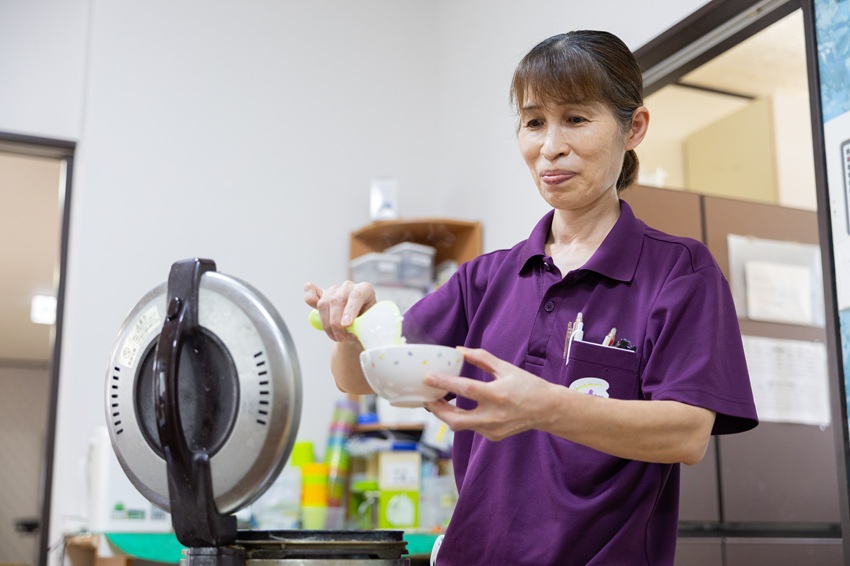 デイサービスは看護師の体制が充実しており、有料スタッフと声を掛け合い連携して体調管理を行っています。スタッフの年齢層も幅広く、ご利用者様とスタッフがまるで一つの大きな家族のように暮らしています。ホームに帰ると、「おかえりなさい」「ただいま」と自然に笑顔の花が咲く ホームに帰ると、「おかえりなさい」 「ただいま」と自然に笑顔の花が咲くような温かい雰囲気と、毎日小さな幸せを感じていただけるように支援を行っています。